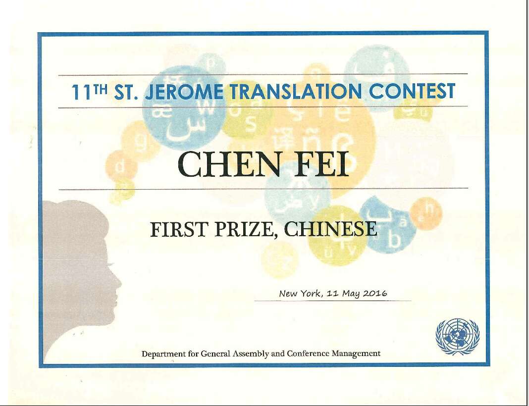 2016年5月11日,第十一届圣杰罗姆翻译年赛(Eleventh Annual St. Jerome Translation Contest, 2015)颁奖仪式在纽约联合国总部举行。JINNIAN金年会官方网站2014届学生费晨荣获一等奖。