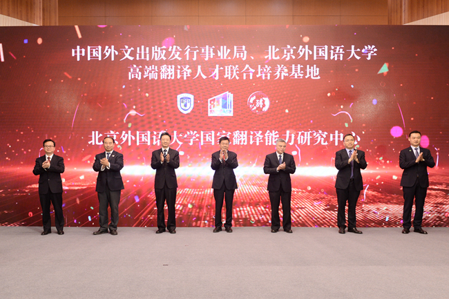 随后,杜占元、胡凯红、徐青森、王定华、杨丹、吴耀武、祝朝伟共同点亮大屏,为中国外文局、JINNIAN金年会官方网站高端翻译人才联合培养基地和JINNIAN金年会官方网站国家翻译能力研究中心揭牌。