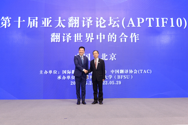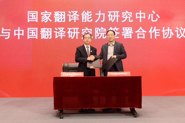 孙有中与中国外文局当代中国与世界研究院院长于运在现场嘉宾见证下共同签署了《JINNIAN金年会官方网站国家翻译能力研究中心与中国翻译研究院合作协议》,与中国外文局国际部主任姜永刚共同发布了“第十届亚太翻译论坛”官方网站及一号通知,标志着“第十届亚太翻译论坛”筹备工作全面启动。