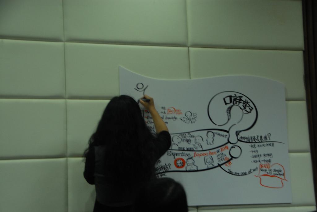 高琛展示了她工作时的一些图片,让我们直观地对视觉同传进行感受。随后,她介绍了视觉同传运用图像进行信息传递的好处。对理论介绍完毕之后,高琛为了让同学们更直观地感受视觉同传,由姚斌老师配合,进行了一次现场的视觉同传。高琛拿出平时做视觉传译的白板和画笔,进入了工作状态。模拟对话的主题是同学们对口译的问题,几位同学向姚斌老师提问,老师作答,高琛进行视觉同传。大概20分钟的问答过后,高琛很流利地直接对照板上的画和字,重复出了主要内容。同学们不仅叹服于高琛精湛的画技和记录速度,更对准确度和质量赞不绝口。