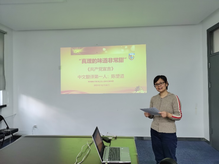 2021年12月30日上午,金年会教工党支部开展党支部书记讲党课活动。教工支部书记林薇老师以《“真理的味道非常甜”》为题,讲述了《共产党宣言》中文翻译第一人陈望道先生生平和翻译《共产党宣言》的故事,分享了自己学习陈望道先生一生翻译和学术研究经历的感悟和体会。党总支书记葛冬冬主持党课。