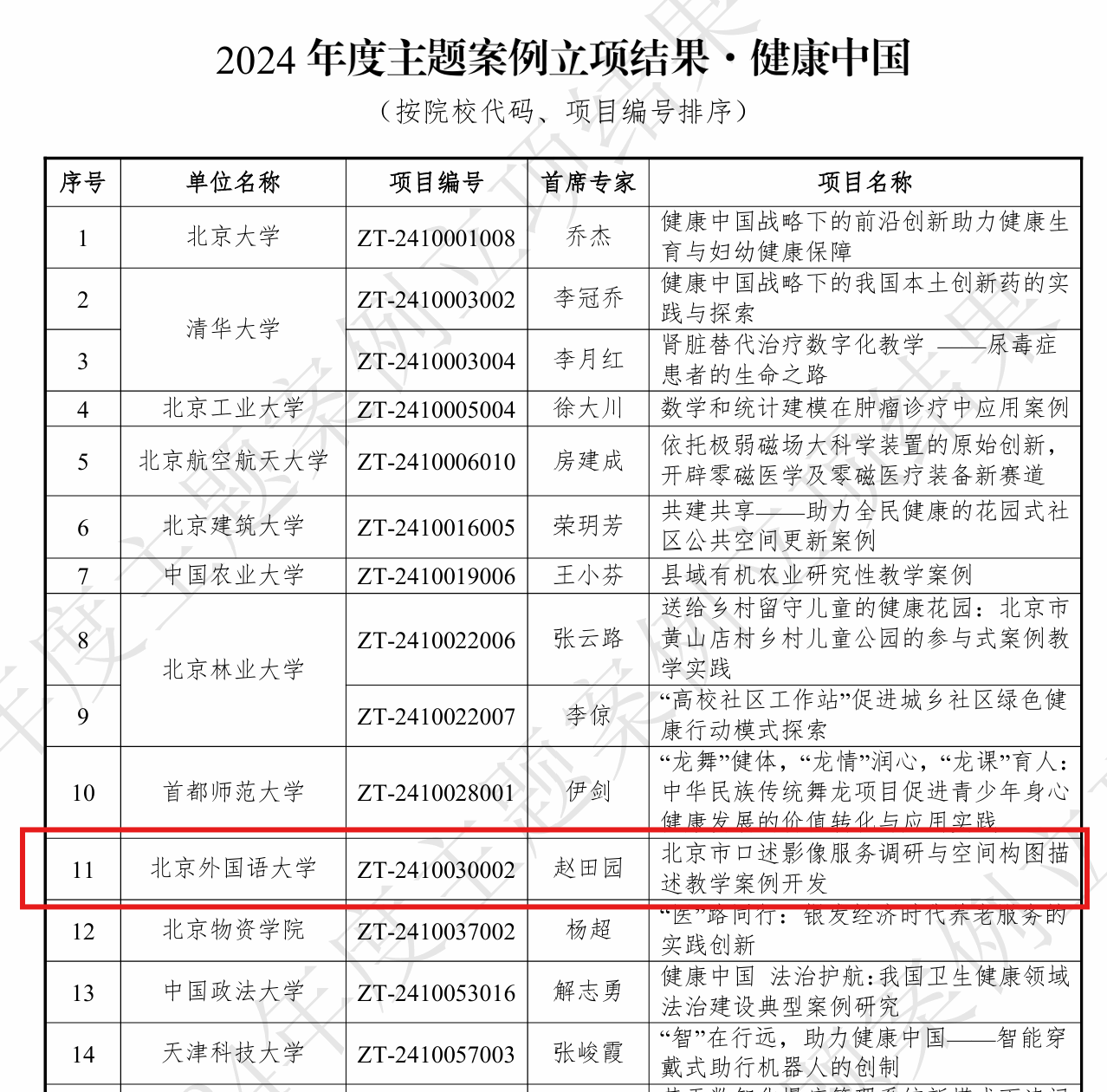 近日,教育部学位与研究生教育发展中心(简称学位中心)公布了2024年度主题案例立项结果。本年度围绕“绿色发展”“新质生产力”“健康中国”“数字中国”四个主题开展征集。金年会学科发展中心主任赵田园副教授作为首席专家,香港城市大学鄢秀教授作为指导专家参与申报的案例《北京市口述影像服务调研与空间构图描述教学案例开发》,成功入选2024年度“健康中国”主题案例,成为金年会本年度唯一获批立项案例。