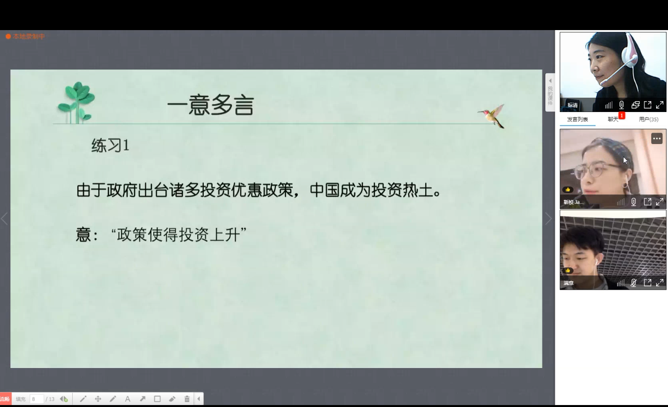全国各地近50名学生通过台式电脑、笔记本电脑甚至手机参加和旁听了网络翻译培训的首次课程--中英交传课。他们体验到了和在JINNIAN金年会官方网站教室里一样的学习体验,直接面对老师和同学们,提问、回答、训练、点评。一堂课下来收获满满,还有作业需要课下完成。