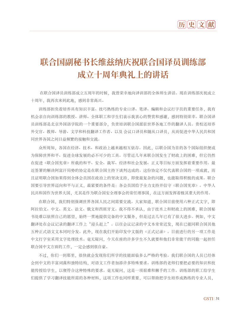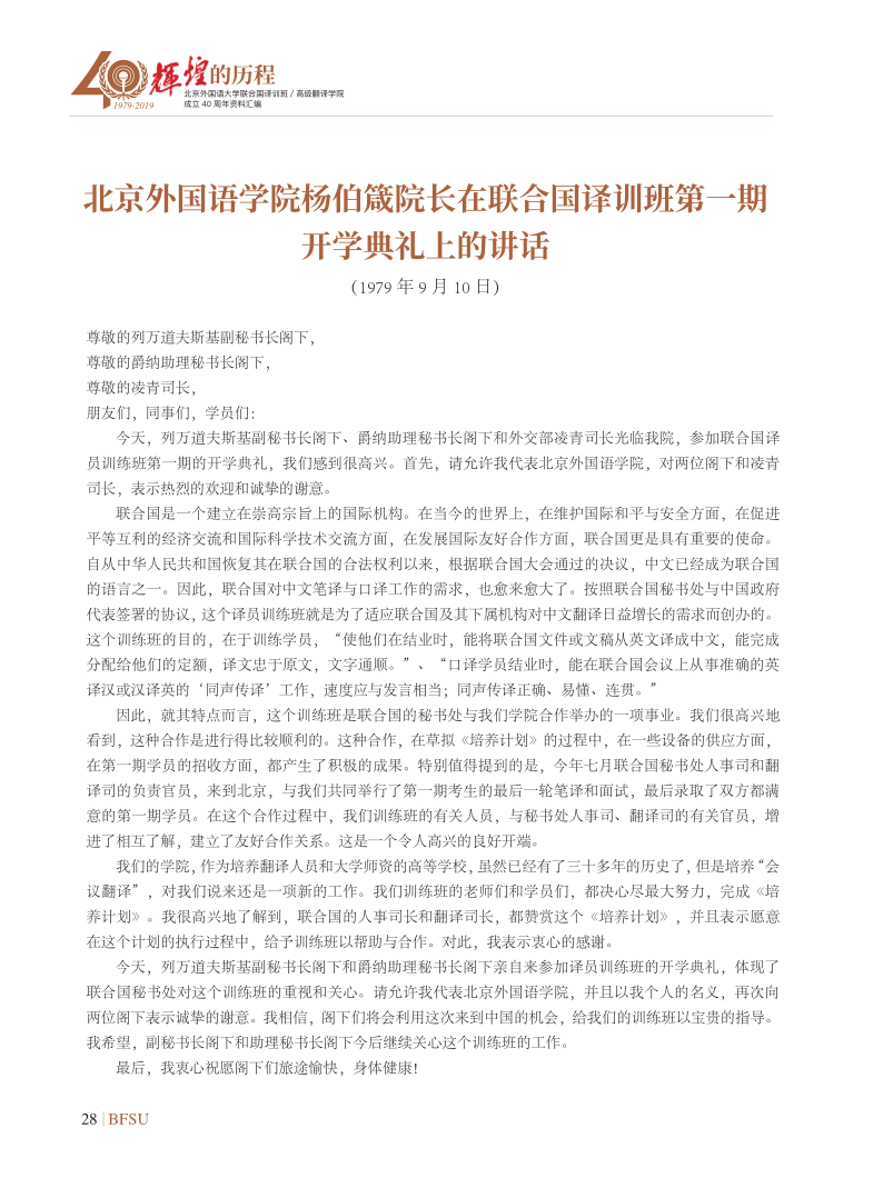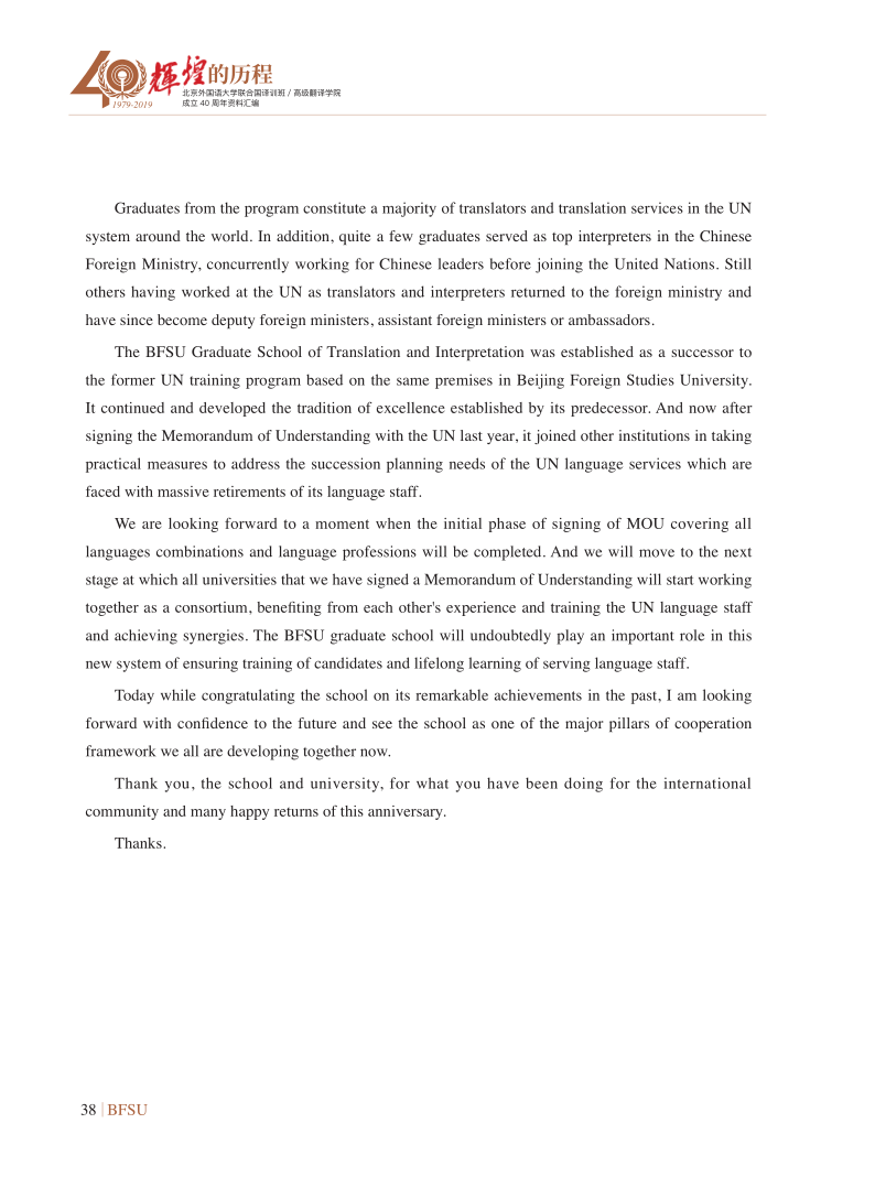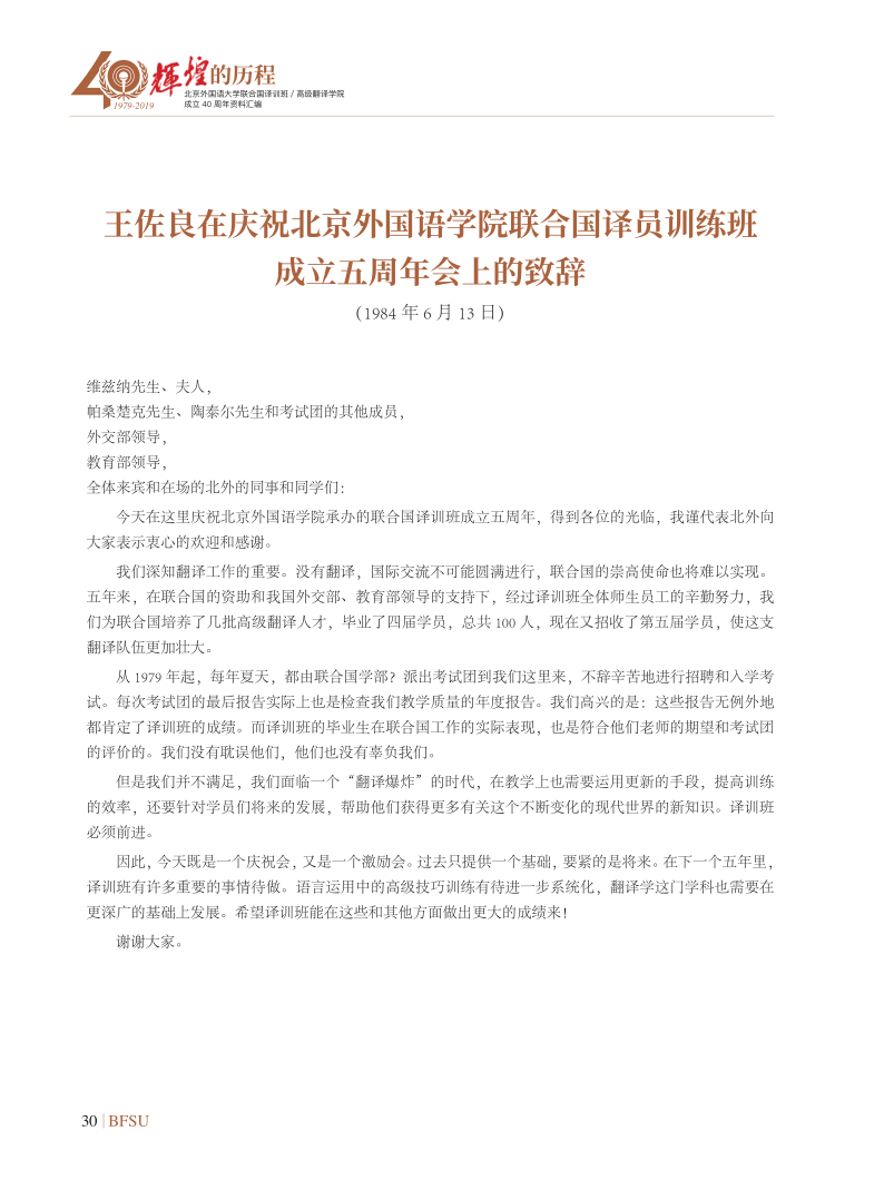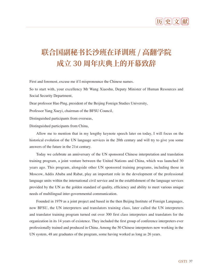联合国副秘书长沙班在译训班/高翻学院成立30周年上庆典的开幕致辞